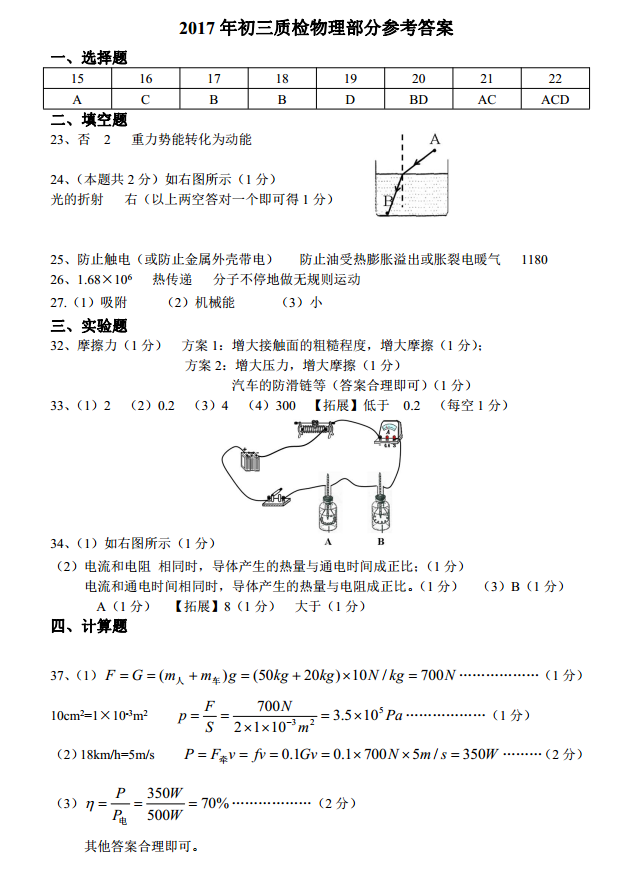 2017年石家庄市初三模拟考试物理试题答案
