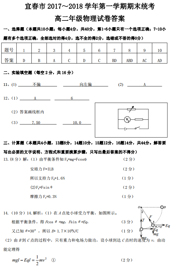 宜春市2017-2018学年第一学期期末统考高二物理试题答案