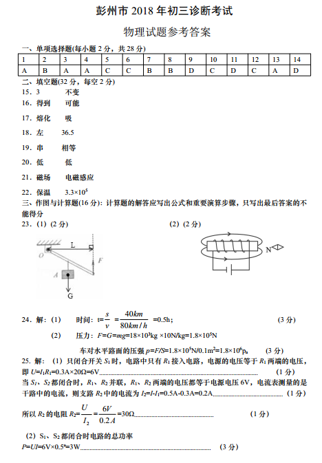 彭州市2018年初三诊断考试物理试题答案