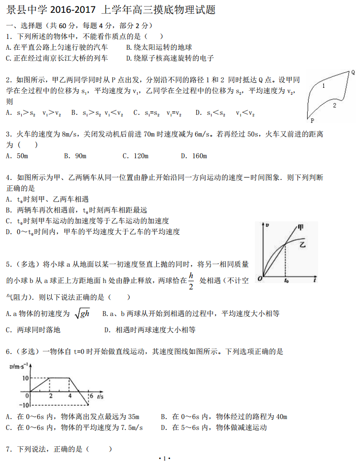 河北景县中学2017届高三上学期摸底考理综物理试题及答案