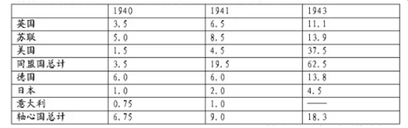 材料 各大国1940-1943年的军火生产 单位:10亿美元(1944年币值)