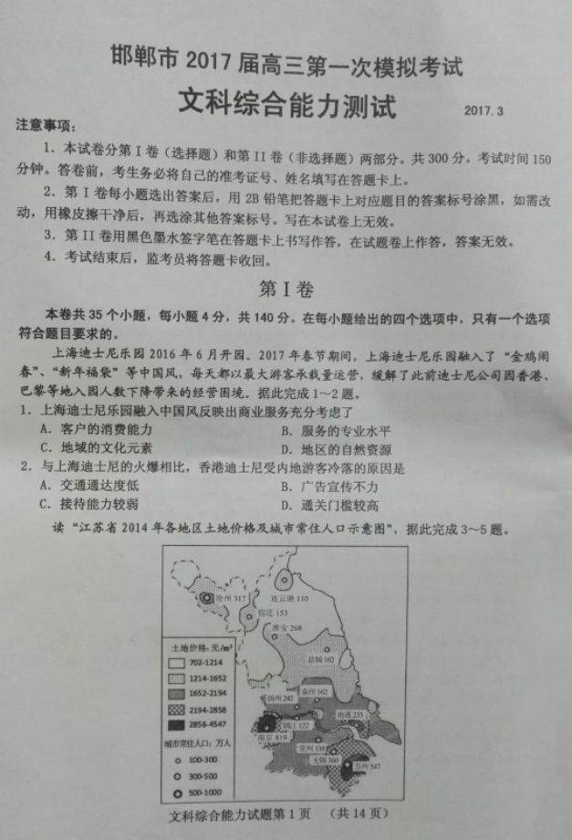 邯郸2017届高三第一次模拟考文综试题及答案
