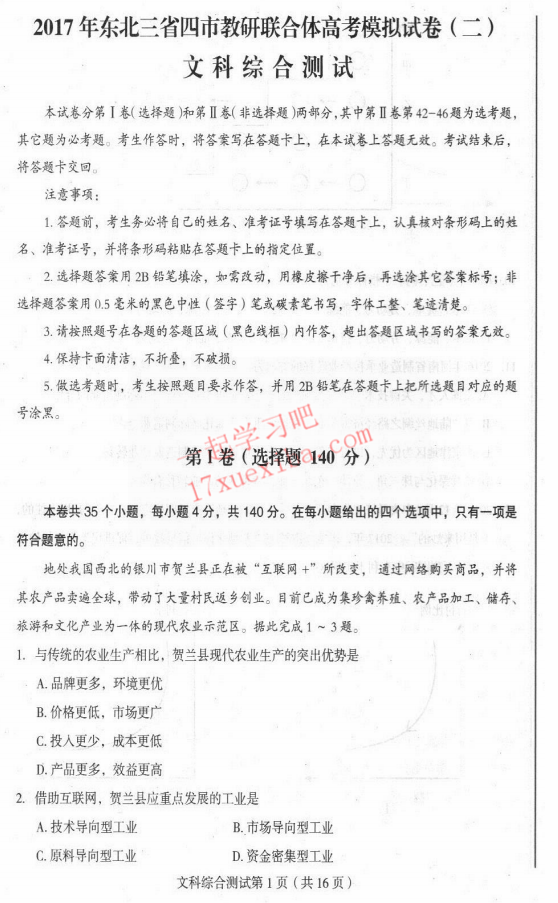 2017年东北三省四市高考第二次模拟考试文综试题及答案