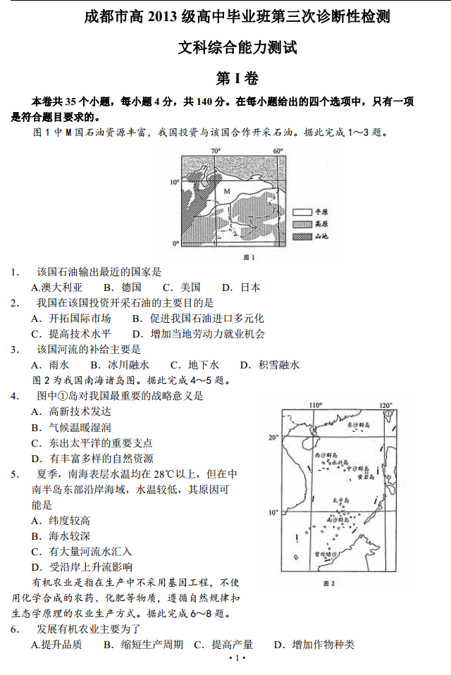 四川省成都2016届高三第三次诊断性考试文科综合试卷及答案