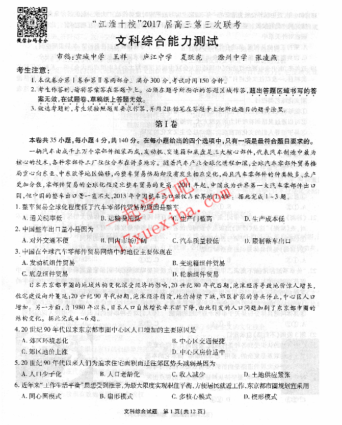 2017江淮十校高三第三次联考文综试题答案