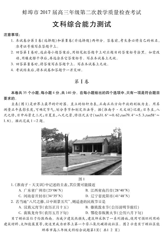 2017蚌埠高三第二次教学质量检查文综试题及答案