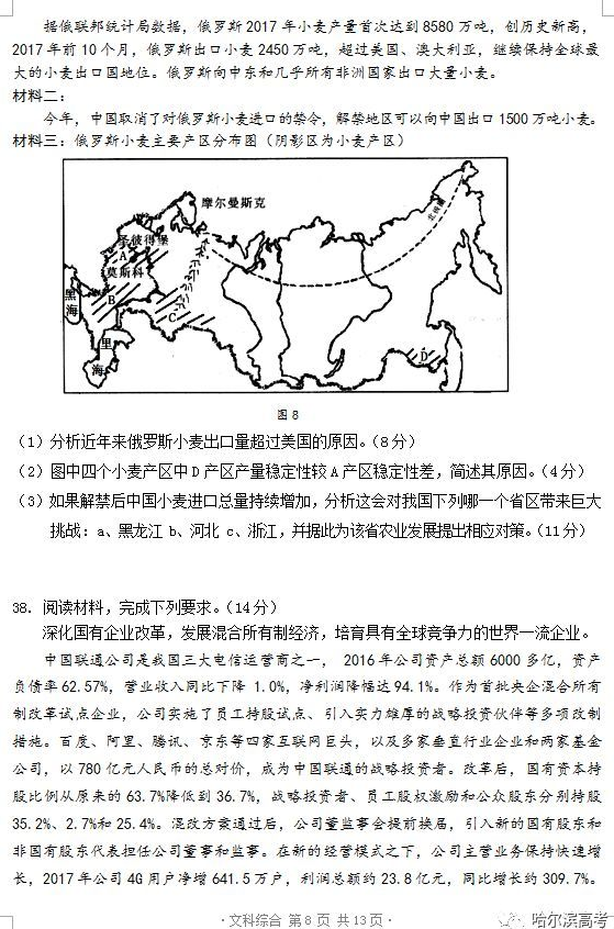 2018年哈三中一模文综试题及答案(8)