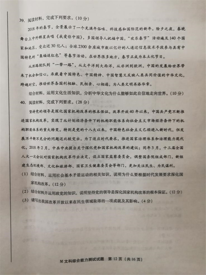2018年福建省高三质量检查文综试题答案(12)