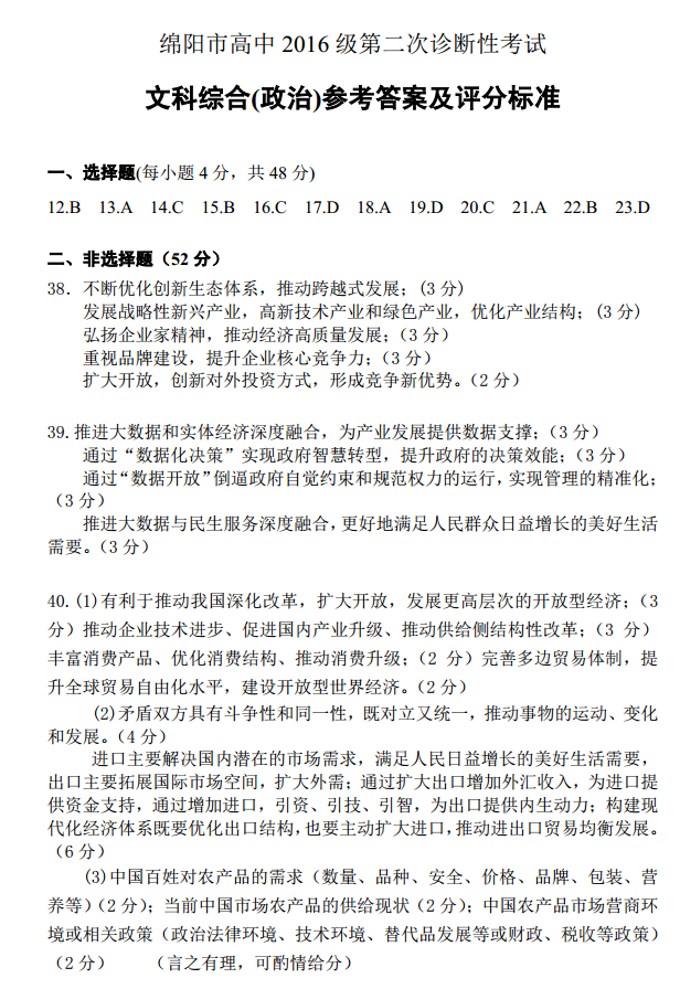 2019绵阳二诊文综试题及答案