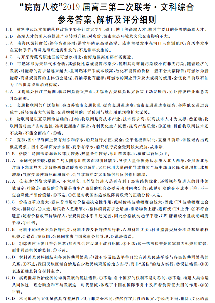 皖南八校2019届高三第二次联考文综试题答案
