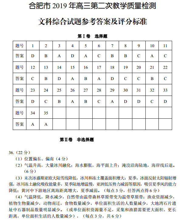合肥市2019年高三第二次教学质量检测文综试题答案