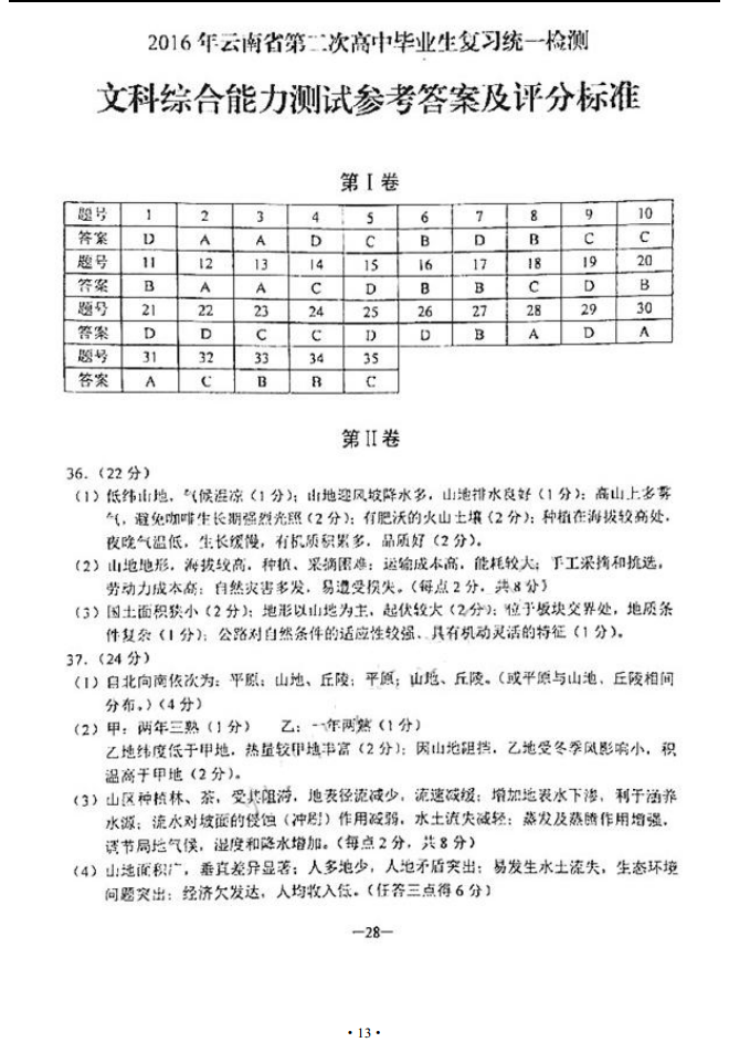 2016云南第二次高中毕业生复习统一检测文综试题及答案(13)