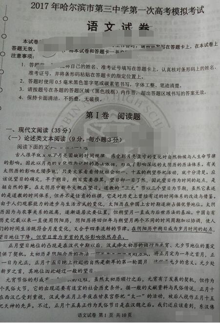 2017年哈三中一模语文试题及答案