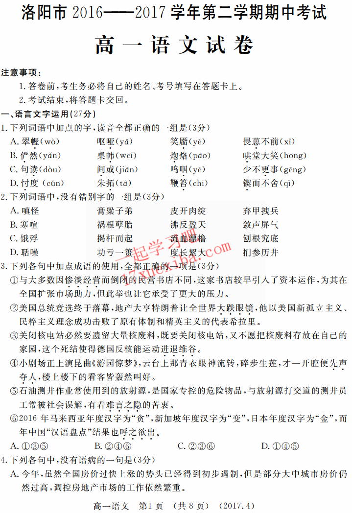 洛阳市2016-2017学年高一期中考语文试题及答案