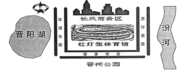 21.请根据下图,介绍山西体育中心“红灯笼”体育馆所在的位置。不超过60字。(6分)
