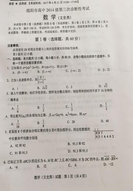绵阳市高中2014级第三次诊断性考试数学文科试题及答案
