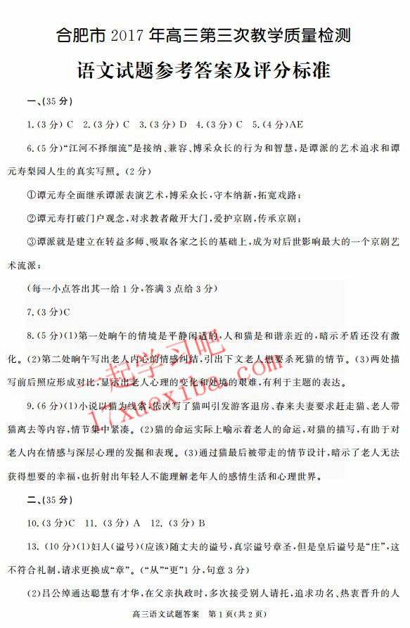 合肥市2017年高三第三次教学质量检测语文试题参考答案及评分标准