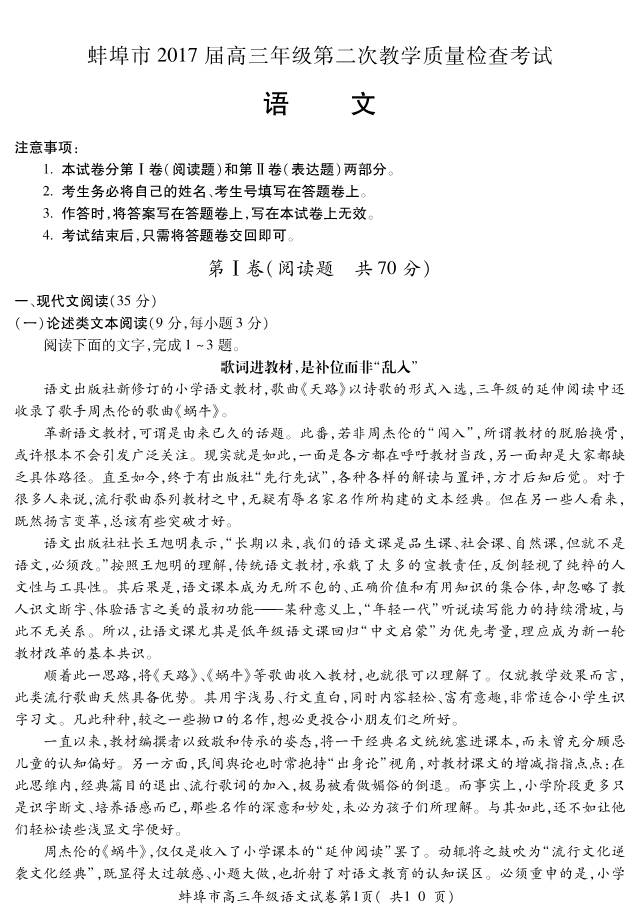 2017蚌埠高三第二次教学质量检查语文试题及答案