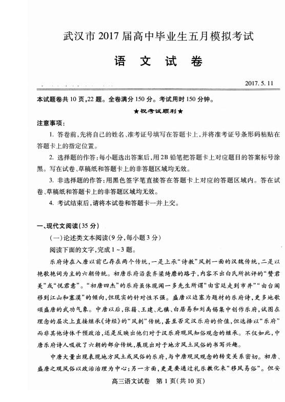 2017年武汉高三5月模拟考语文试题及答案