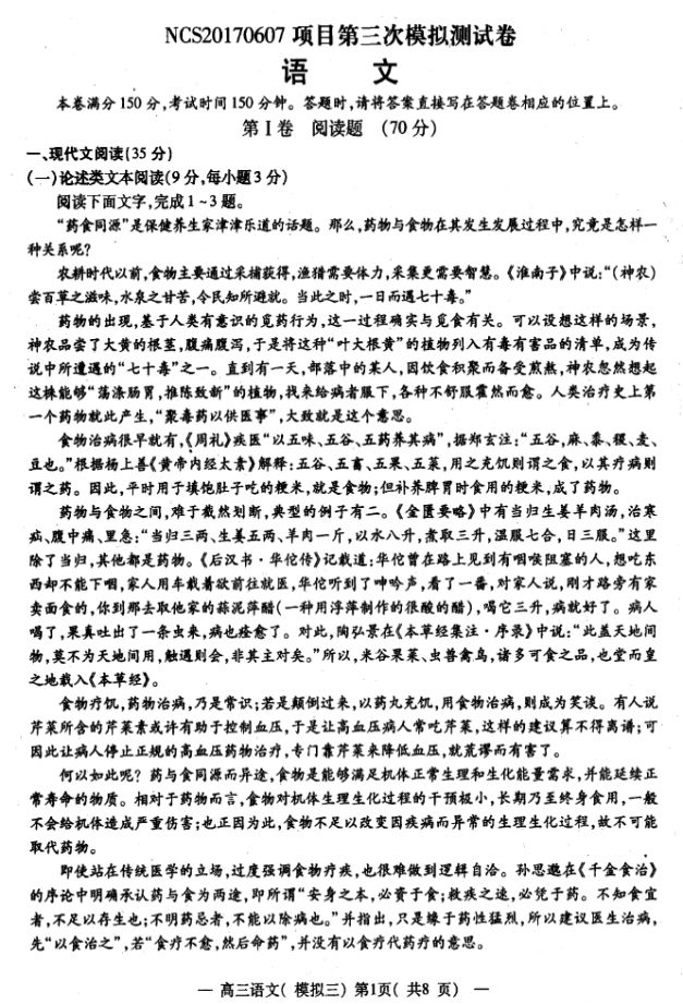 2017南昌高三三模语文试题及答案