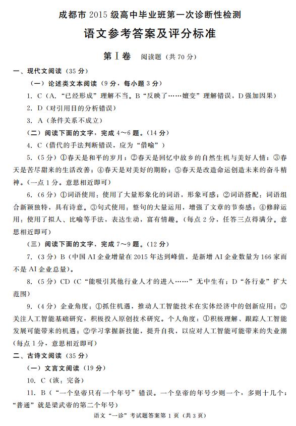 2018成都一诊语文试题答案