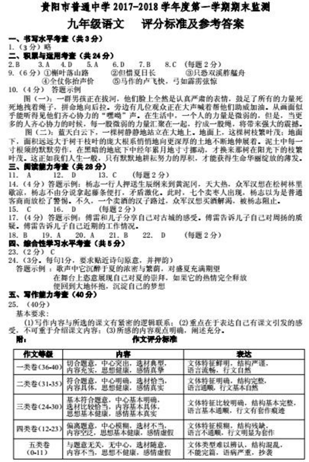 贵阳市2017-2018年第一学期期末考九年级语文试题答案