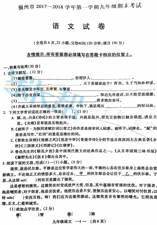 福州市2017-2018学年九年级第一学期期末质检语文试题及答案