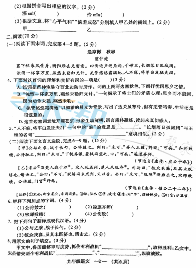 福州市2017-2018学年九年级第一学期期末质检语文试题及答案(2)