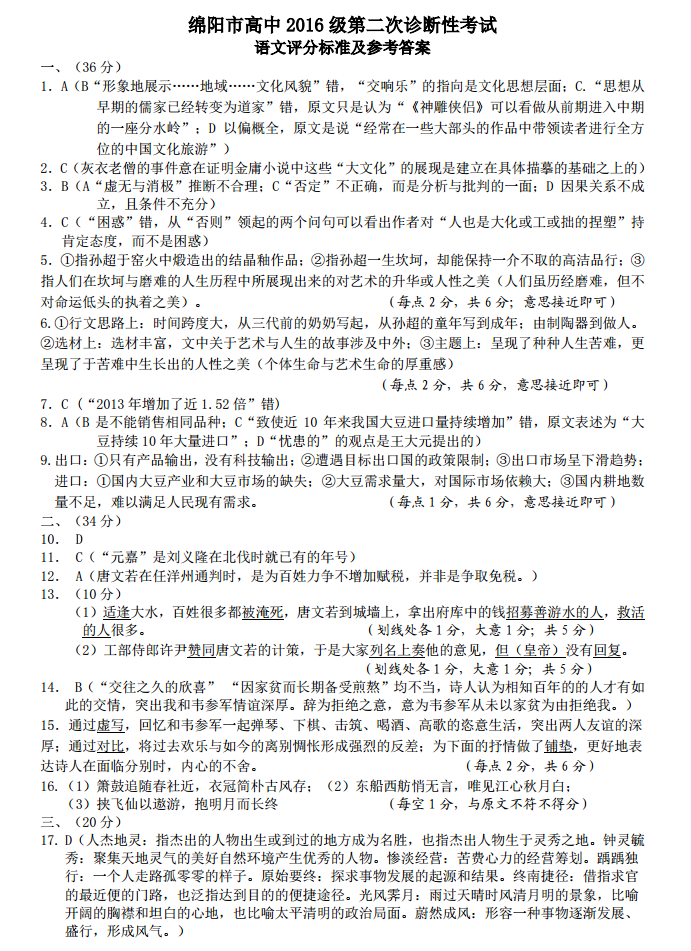 2019绵阳二诊语文试题及答案