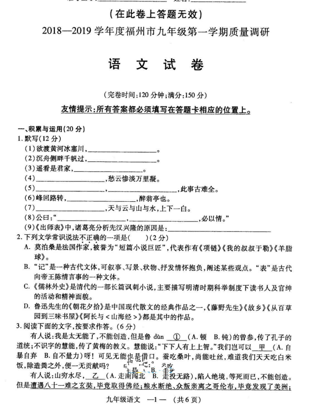 福州市2018-2019学年第一学期九年级期末质量检测语文试题答案