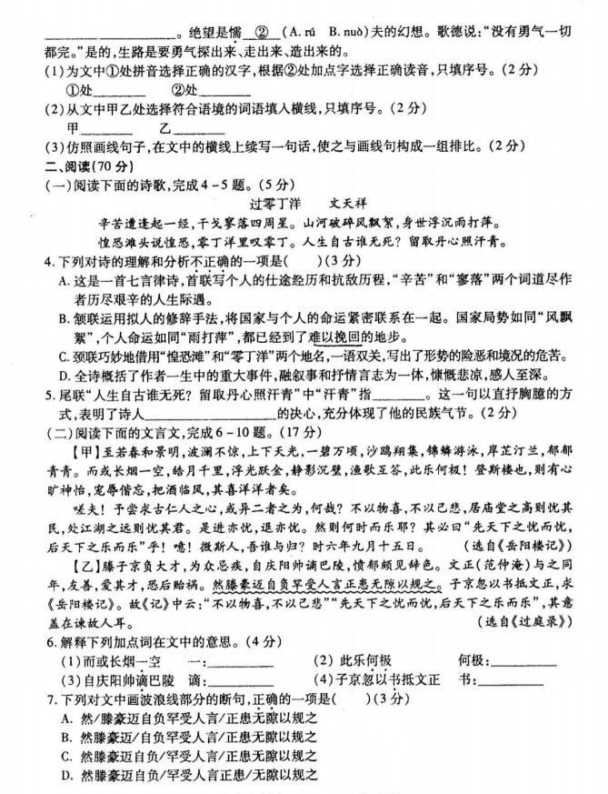 福州市2018-2019学年第一学期九年级期末质量检测语文试题答案(2)