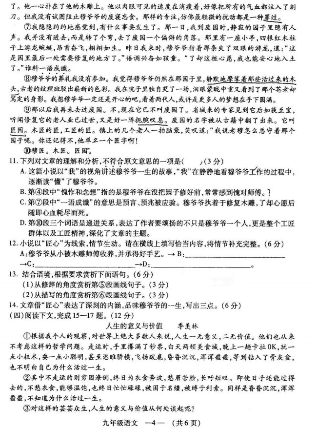 福州市2018-2019学年第一学期九年级期末质量检测语文试题答案(4)