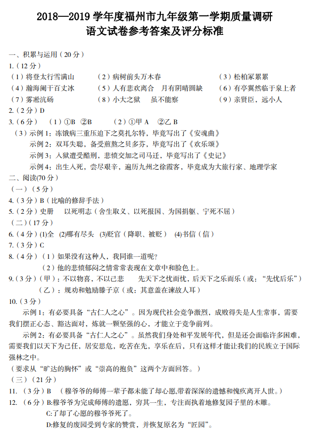 福州市2018-2019学年第一学期九年级期末质量检测语文试题答案(7)