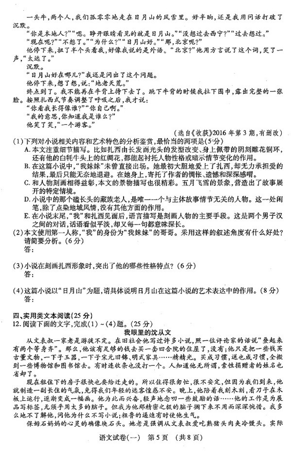 2017届江西高三第一次联考测试卷语文试卷及答案(5)