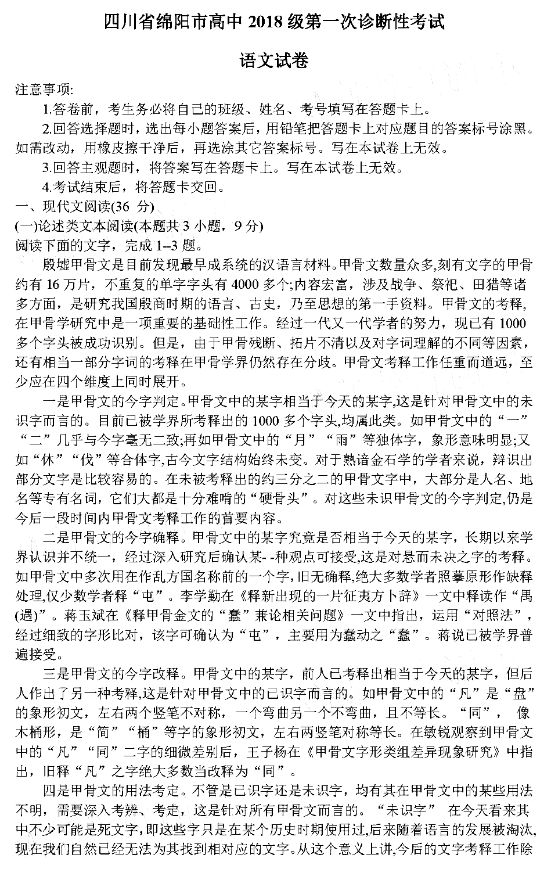 2021年绵阳一诊语文试题及答案