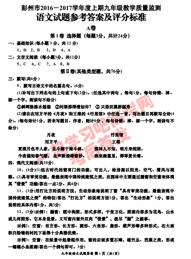 彭州市2016-2017学年九年级上期教学质量检测语文试题答案