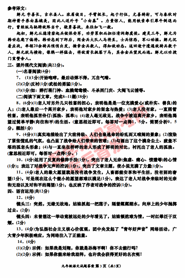 彭州市2016-2017学年九年级上期教学质量检测语文试题答案(3)