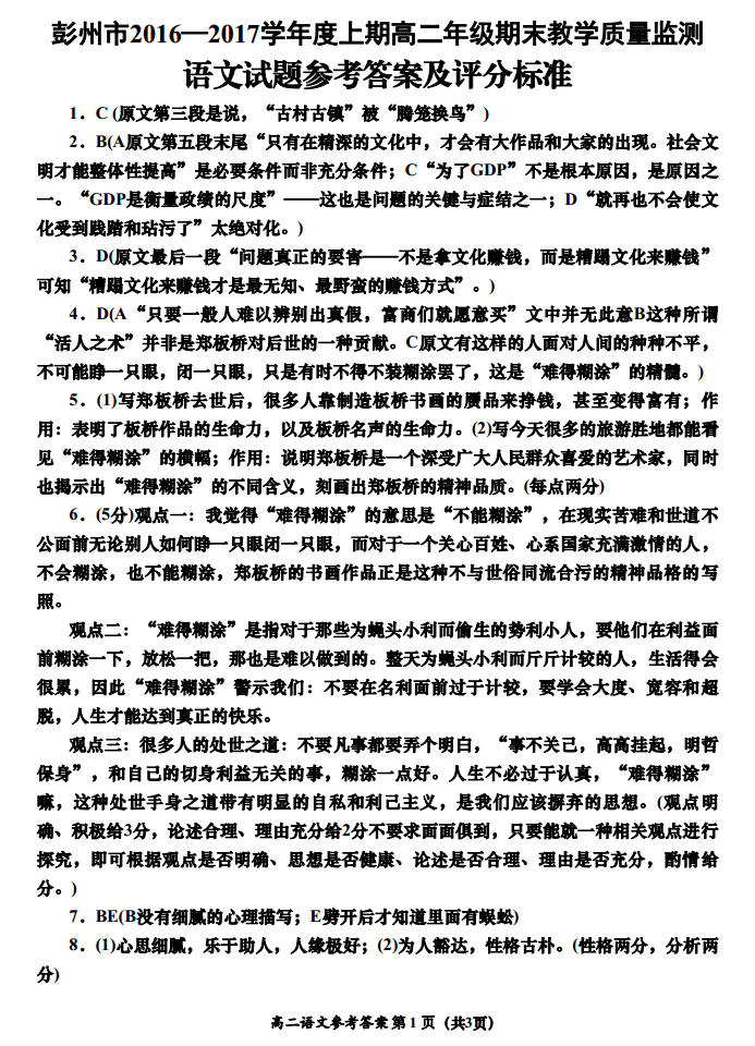 彭州市2016—2017学年上期期末学业测试高二语文试题答案