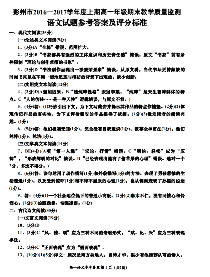 彭州市2016—2017学年上期期末学业测试高一语文试题答案