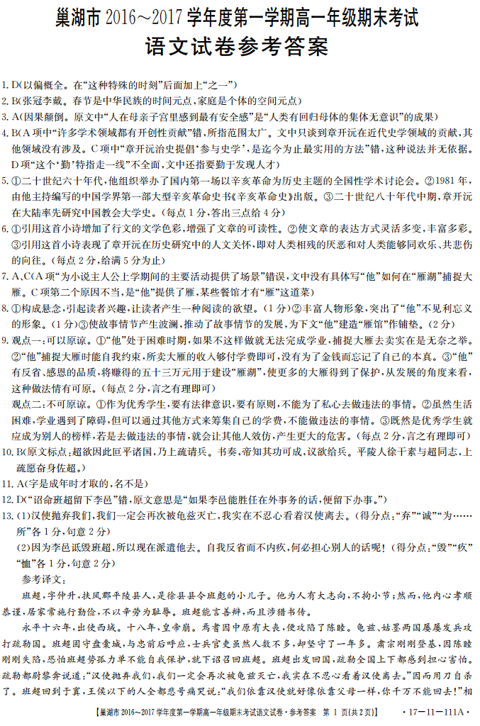巢湖市2016-2017学年第一学期期末考高一语文试题答案