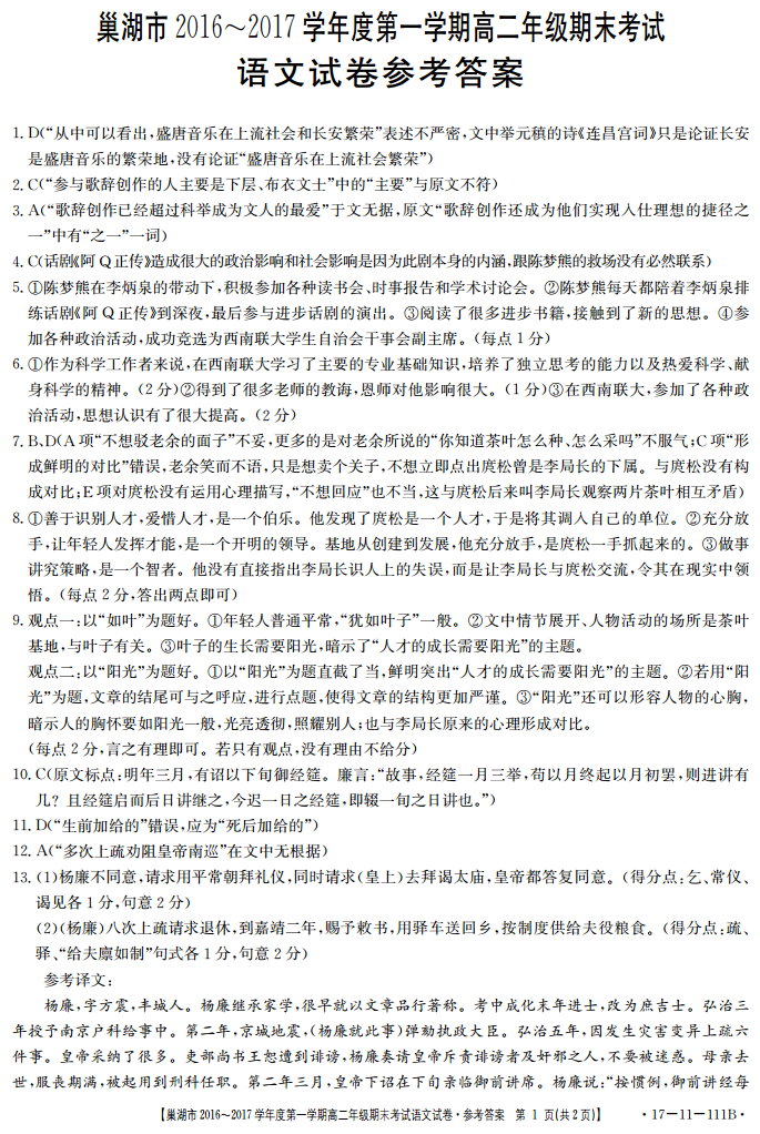 巢湖市2016-2017学年第一学期期末考高二语文试题答案