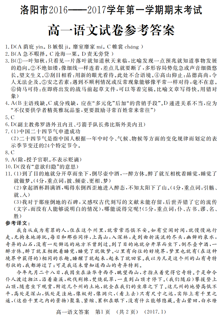 洛阳市2016—2017学年第一学期期末考高一语文试题答案