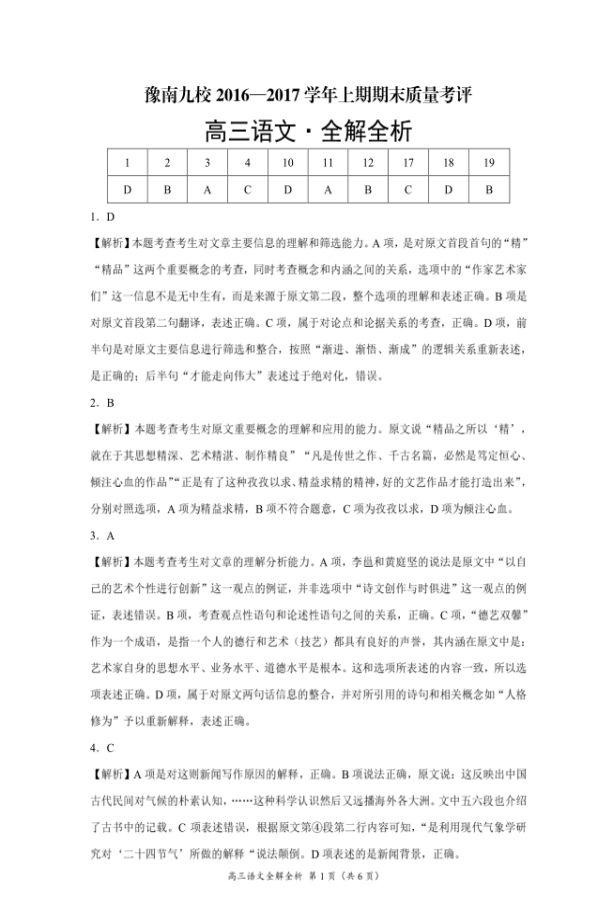 豫南九校2016-2017学年上期期末质量考评高三语文试题及答案(9)