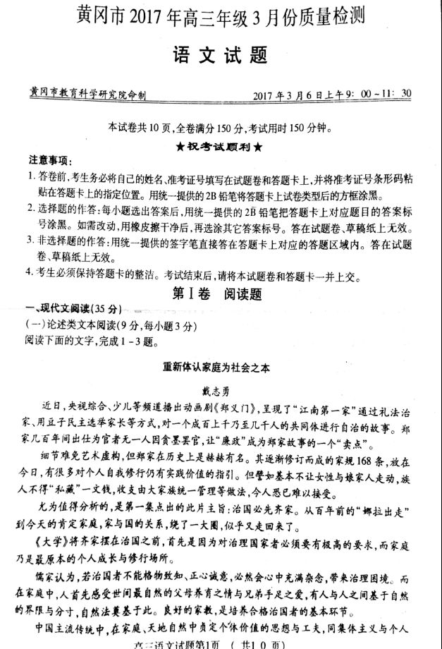 黄冈市2017届高三3月质量检测语文试题及答案
