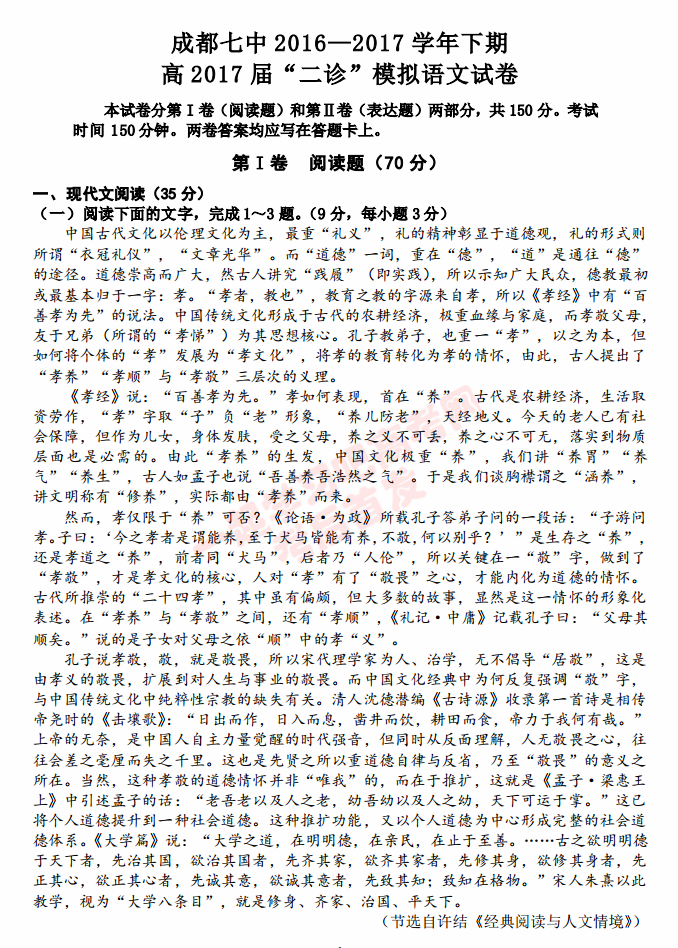 四川成都七中2017届高三二诊语文试题及答案