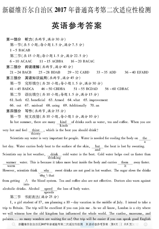新疆维吾尔自治区2017届高三第二次适应性检测英语答案