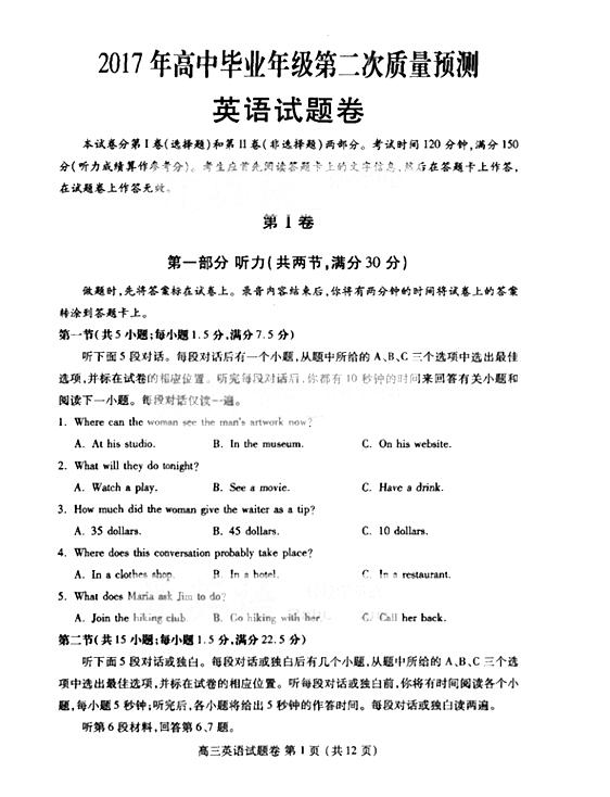 2017郑州高中毕业班第二次质量预测英语试题及答案