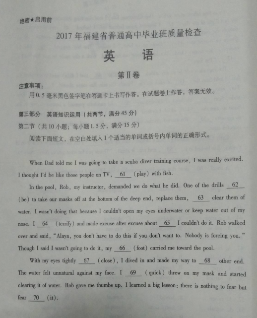 2017年福建省高中毕业班质量检查英语试题及答案(11)