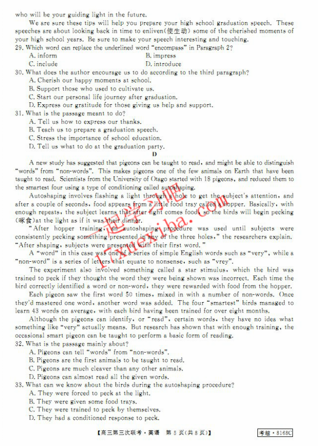 皖南八校2017届高三第三次联考英语试题答案(5)