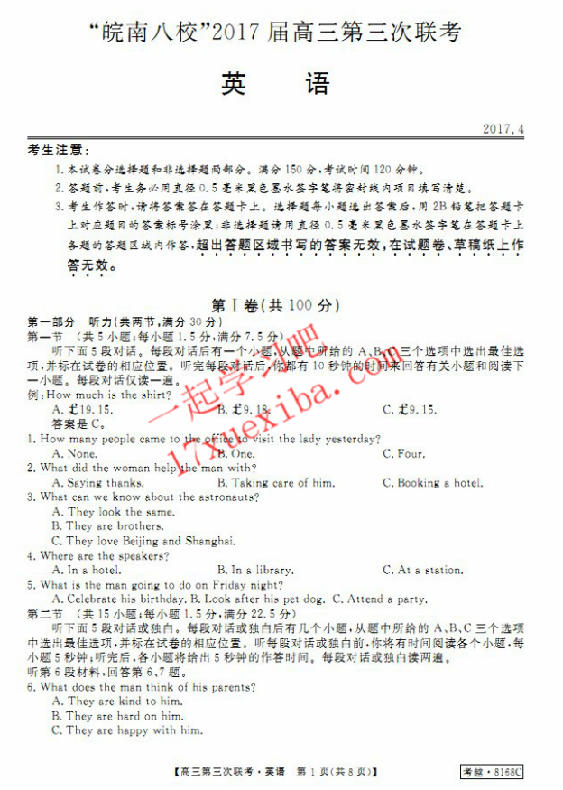 安徽皖南八校2017届高三第三次联考英语试题及答案